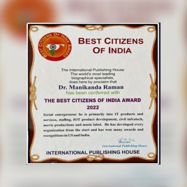 In 2022, the International Publishing House, the world's largest biographical specialist, awarded him 'The best citizen of India award' for his range of interests in IT products and services, staffing, IoT product development, civil infrastructure, movie production, and music label.