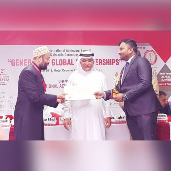 Presented with the "International Gold Star Award for Business Excellence 2019" at the 12th International Achievers Summit, Dubai (UAE), for achieving remarkable success, contributing significantly to the community, and showing exceptional character and leadership