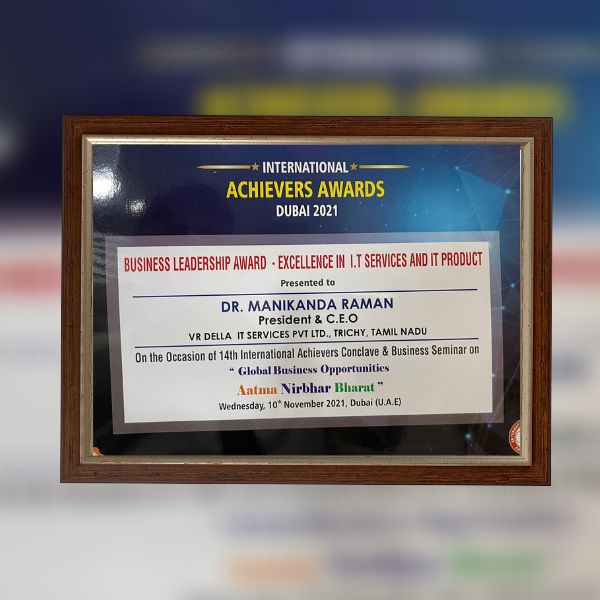 The International Achievers Awards Dubai 2021 presented the Business Leadership Award for excellence in IT services and products. It was held at the 14th International Achievers conclave business seminar on Global Business Opportunities at Aatma Nirbhar Bharat on 10th November 2021.