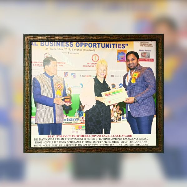 Honored with 'The Best IT Service Provider Company Excellence Award' on the occasion of the 13th International Achievers Summit on Global Business Opportunities, presented by Honorable H.E. Korn Dabbaransi, Former Deputy Prime Minister of Thailand, and H.E. Princess Isabelle Lafforgue, France, on 21st December 2019 in Bangkok, Thailand.